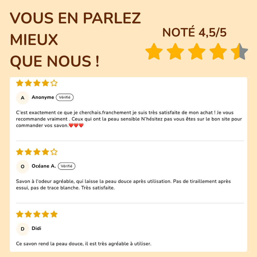 • Huile de coco : nourrit la peau et offre une mousse douce et généreuse.